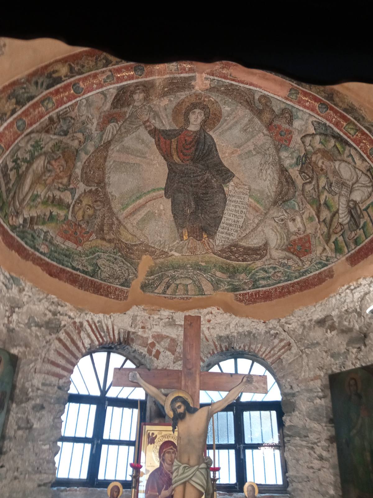 βυζαντινών τοιχογραφιών που κοσμούν τον ναό. Στο ψηφιδωτό απεικονίζεται το